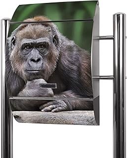 Banjado Briefkasten Edelstahl mit Ständer | Postkasten freistehend 126x53x17cm | Standbriefkasten mit Zeitungsfach und Namensschild Motiv Gorilla